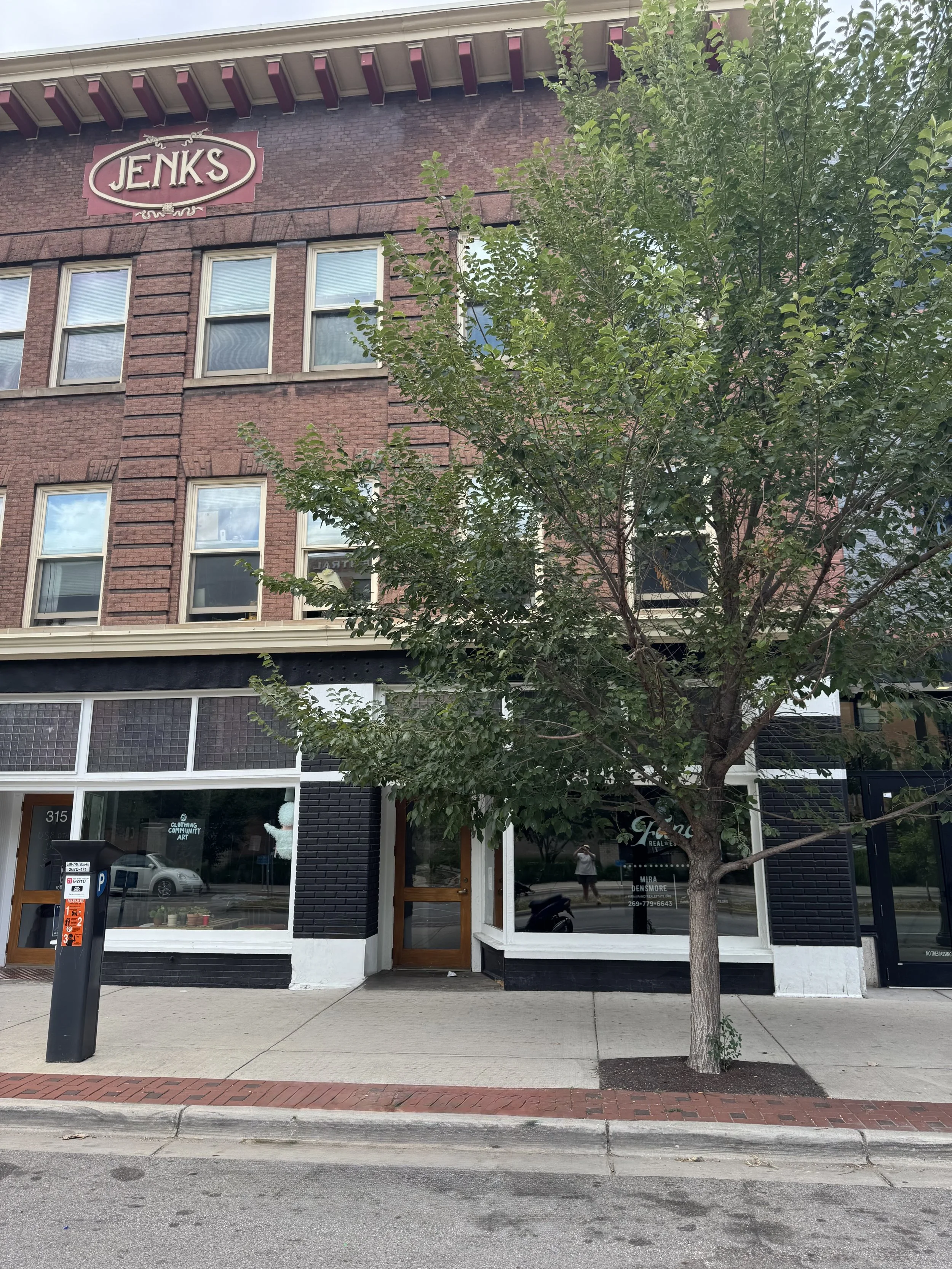 Street view of a brick building with a tree in front; a business named Jenks on the upper level; storefront with large windows and a wooden door at ground level.