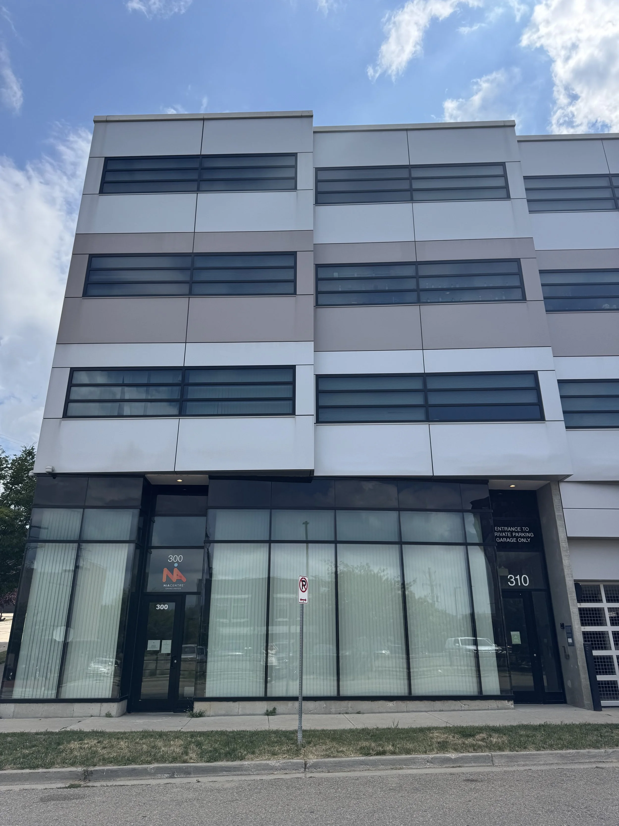 Modern multi-story building with glass storefront on the ground floor, the address 300 on the window, a sign indicating entrance for private parking, and a no parking sign on a pole in front.