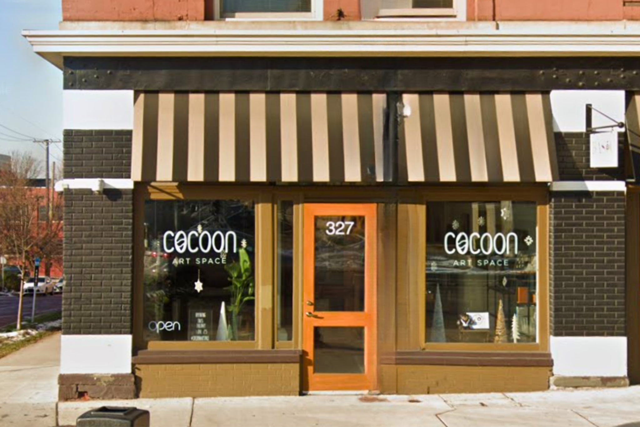 Storefront with black brick and white accents, striped awning, large front windows displaying art, and a wooden door with the address 327. Sign reads 'cocoon art space' and 'open'.