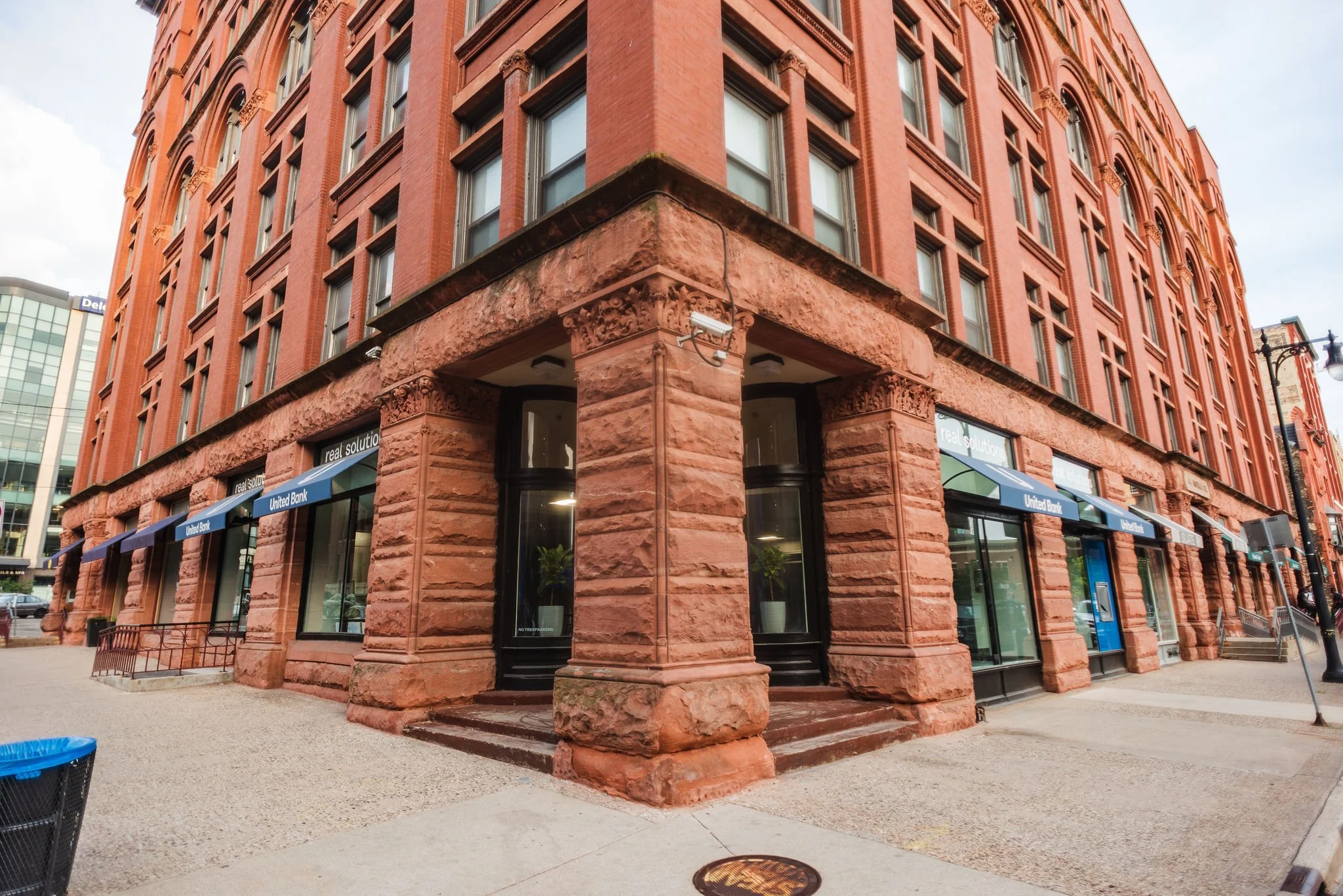 Corner view of a red brick building with large windows and storefronts, including United Bank, on a city street.