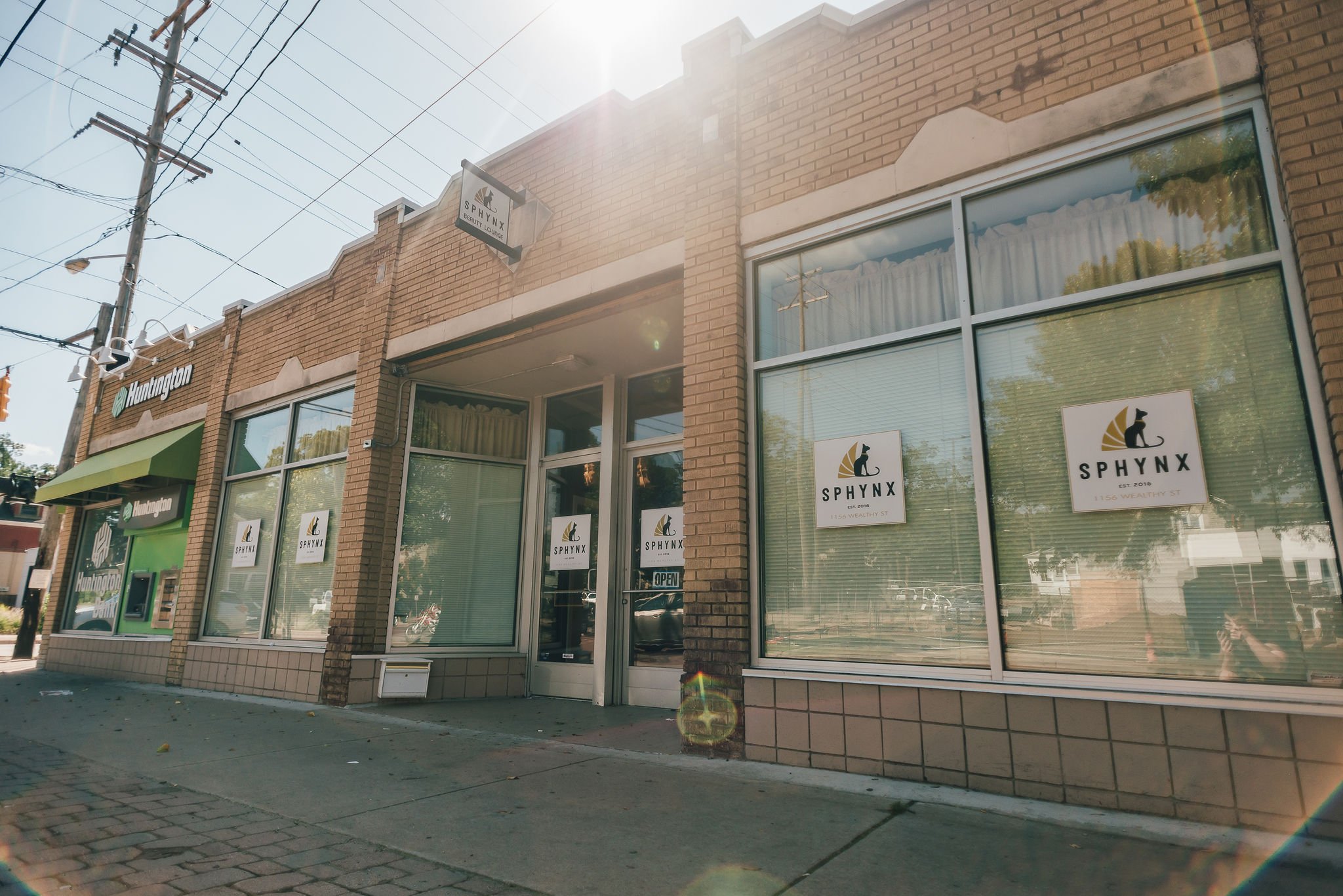 Storefront with signs for Huntington bank and Sphynx beauty salon, brick exterior, sidewalk in front, sunlight glare