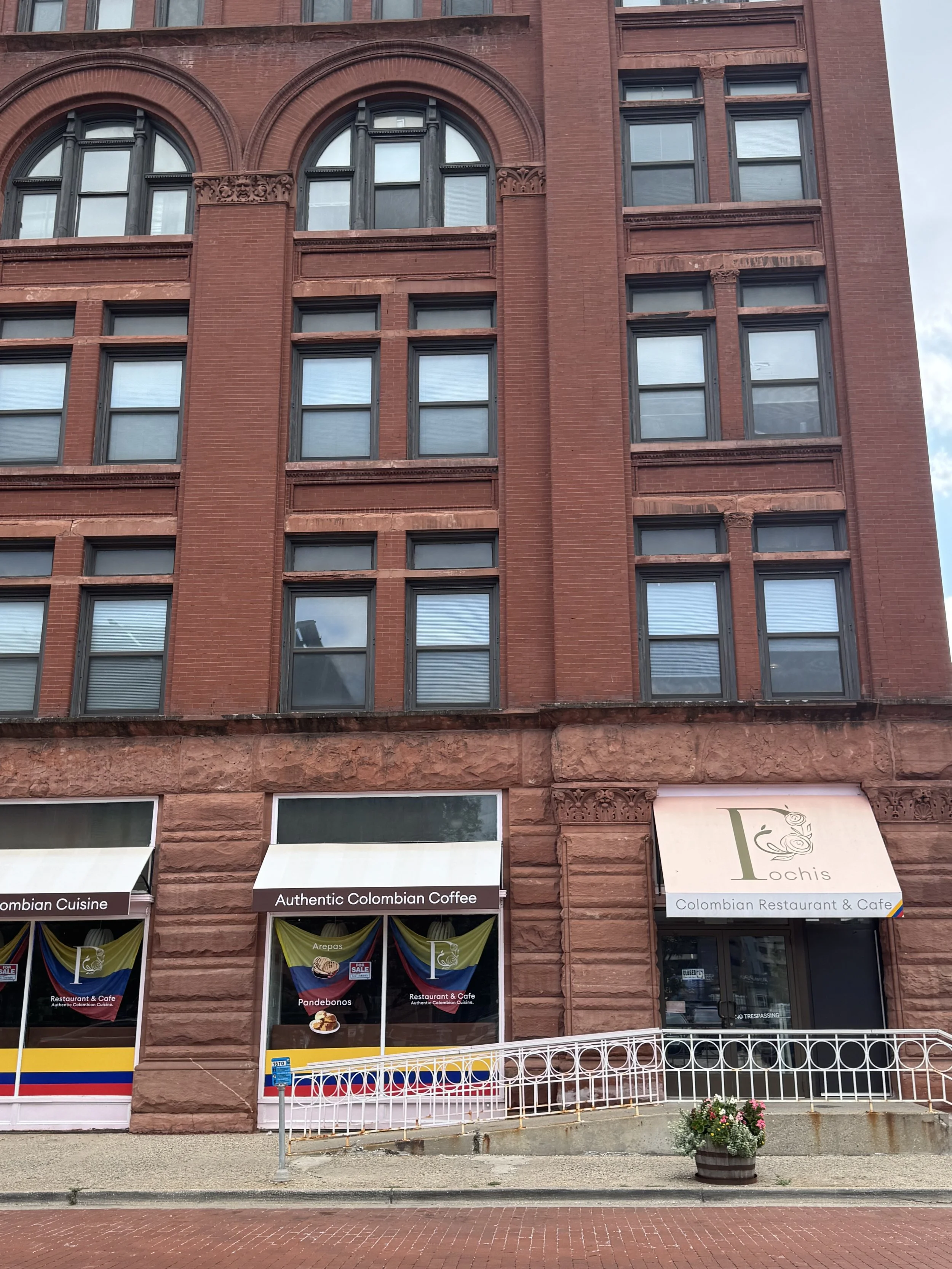 The image shows the exterior of a red brick building with large windows and storefronts at street level for a Colombian restaurant and cafe called Llochis, which offers authentic Colombian cuisine and coffee. There are signs and awnings advertising Colombian dishes like arepas and pandebonos, and a flower pot with pink and white flowers in front of the entrance.